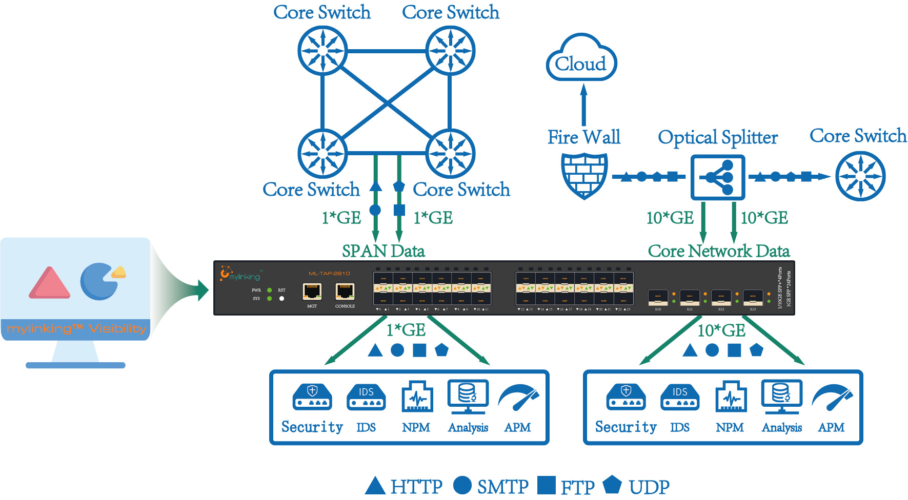 A Network TAP (Test Access Points) ke sesebelisoa sa Hardware bakeng sa ho hapa, ho fihlella, le ho sekaseka data e kholo e ka sebelisoang ho marang-rang a mokokotlo, marang-rang a mantlha a mehala, marang-rang a mantlha le marang-rang a IDC. E ka sebelisoa bakeng sa ho hapa sephethephethe sa likhokahano, ho pheta-pheta, ho kopanya, ho sefa, ho aba, le ho leka-lekanya mojaro. Network Tap hangata ha e sebetse, ebang ke ea optical kapa ea motlakase, e etsang kopi ea sephethephethe sa marang-rang bakeng sa ho beha leihlo le ho hlahloba. Lisebelisoa tsena tsa marang-rang li kentsoe sehokelong se phelang molemong oa ho fumana temohisiso mabapi le sephethephethe se tsamaeang ka har'a sehokelo seo. Mylinking e fana ka tharollo e feletseng ea 1G/10G/25G/40G/100G/400G sephethephethe sa marang-rang, li-analytics, tsamaiso, tlhokomelo ea lisebelisoa tsa ts'ireletso tsa inline le lisebelisoa tsa ho hlahloba ntle le sehlopha.